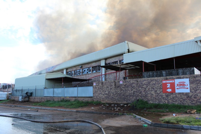 Hundreds of pedestrians gathered outside the Jumbo Cash and Carry in Crown Mines, Main Reef Road, to witness the warehouse burn.